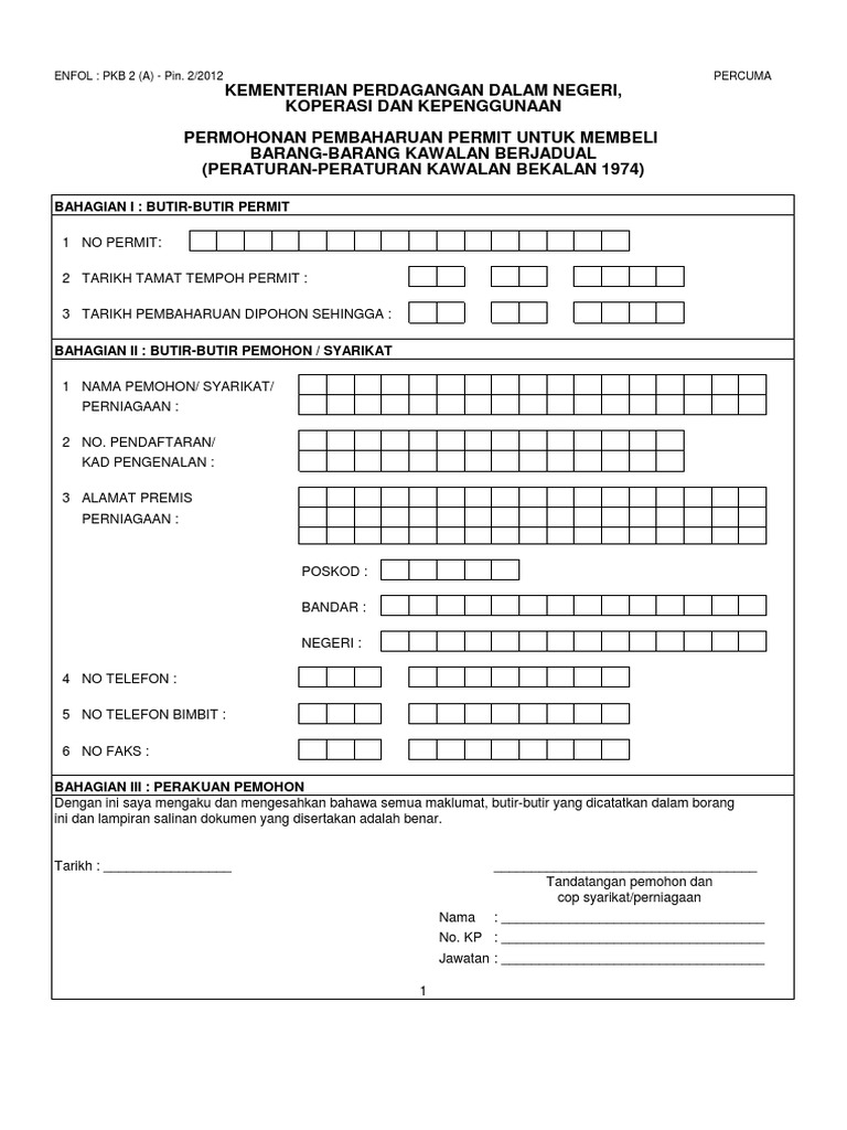 1borang Pembaharuan Permit Barang Kawalan Berjadual from imgv2-1-f.scribdassets.com Mengisi borang tersebut dengan lengkap dalam dua (2) salinan, 3. Penguatkuasaan bekalan ▪bekalan mencukupi ▪mempunyai lesen barang kawalan berjadual. *lain lain* naziran permit barang kawalan lpg di kilang sumirubber sdn bhd, bakar arang. Selain daripada cara melalui aplikasi gerak malaysia bagi memohon pergerakan rentas negeri, orang ramai juga boleh memohon dengan mengisi borang permit pergerakan perintah kawalan pergerakan (pkp) yang disediakan oleh polis diraja malaysia (pdrm). Muat turun borang permit pergerakan perintah kawalan pergerakan bersyarat (pkpb). Memuat turun borang permit pergerakan perintah kawalan pergerakan bersyarat (pkpb) di media sosial rasmi mkn. Tarikh perlaksanaan kawalan regulatori api untuk permohonan baru produk generik yang mengandungi racun berjadual bagi produk dalam semua bentuk dos berkuatkuasa 1 julai 2018. Terdahulu, beliau ditemu selepas meninjau bekalan keperluan asas di sebuah pasaraya di sini hari ini.